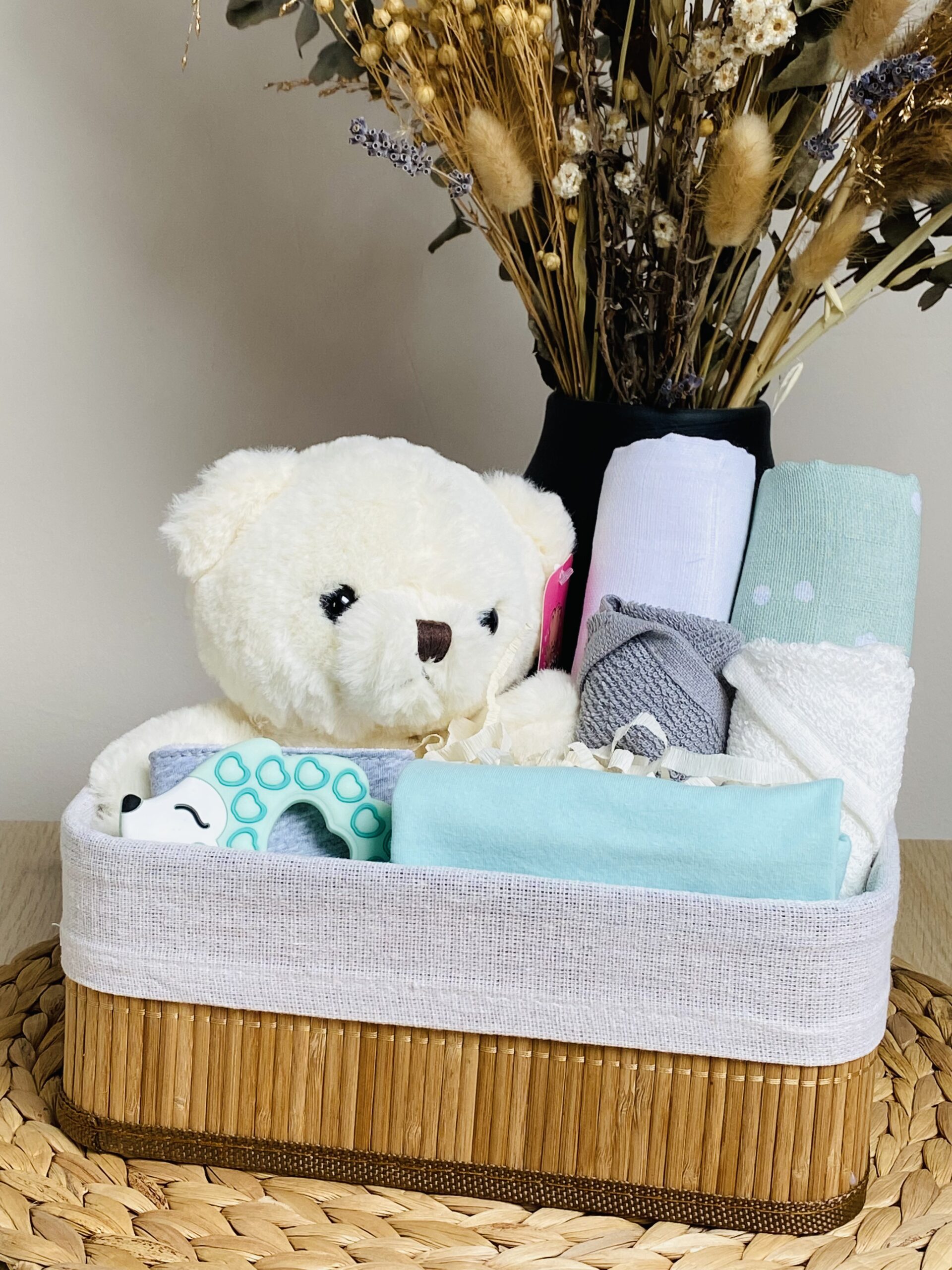Kraamcadeau met siliconen bijtring – blauw en grijs