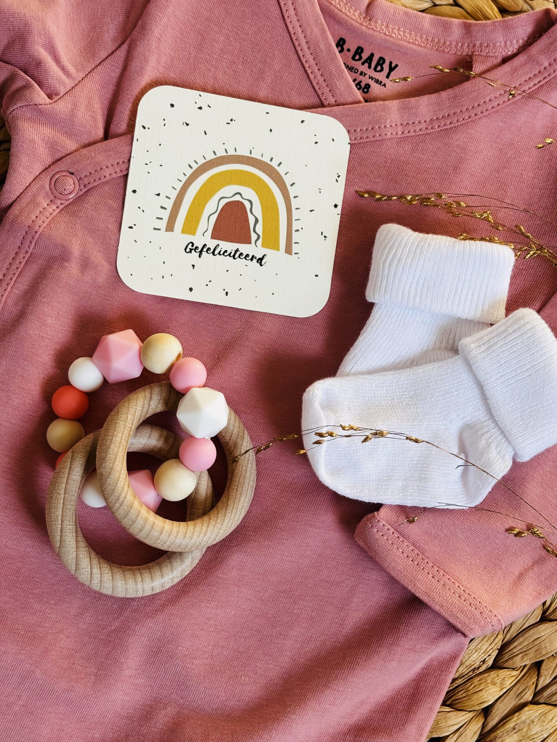 Origineel kraamcadeau met bijtring – roze