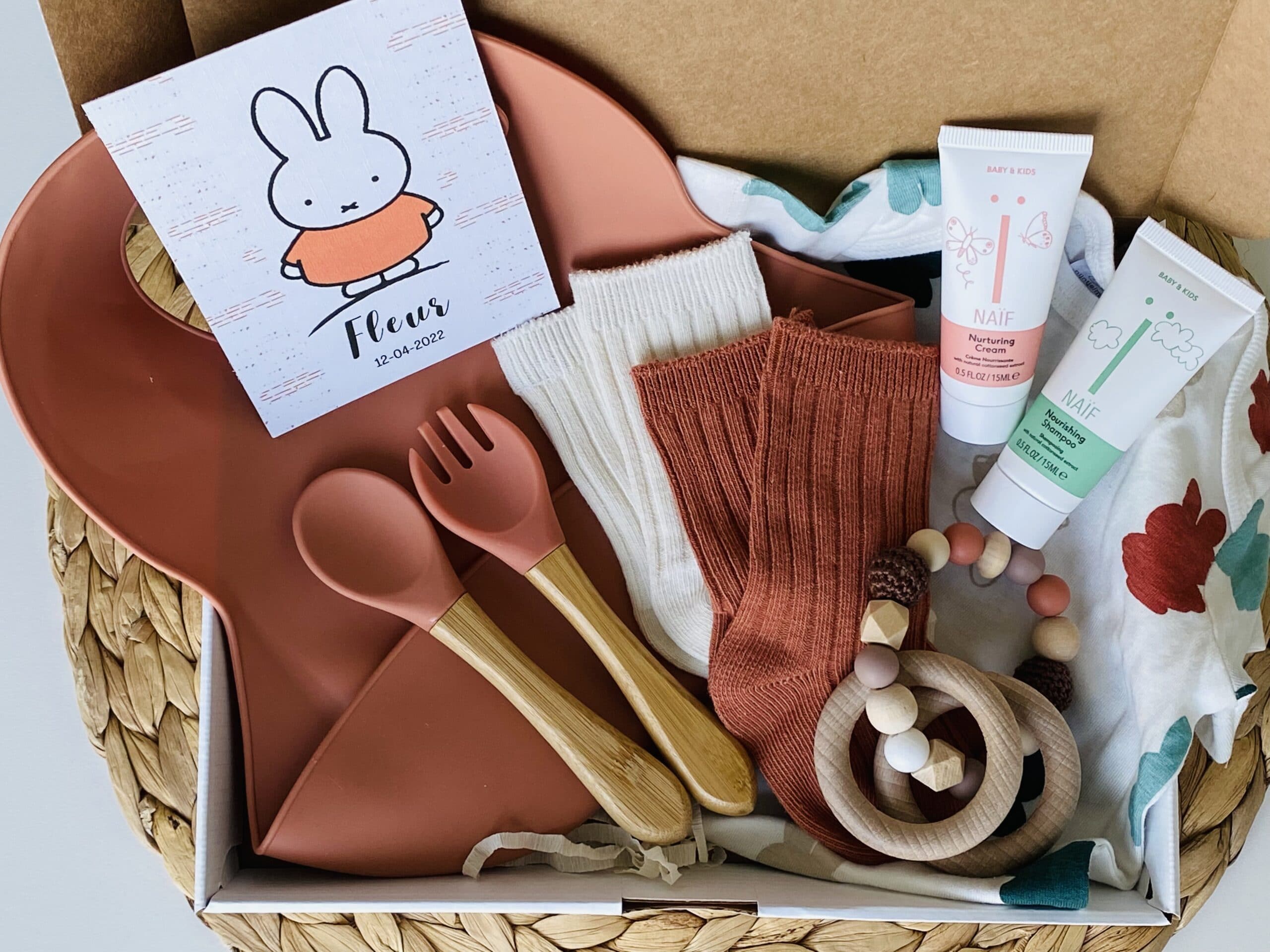 Deze geweldige kraamcadeau bevat een baby romper met Nijntje maat 62/68, twee paar baby sokjes maat 62/68, een baby bijtring, een siliconen slabbetje, een set bamboe/siliconen bestek, een verzorgende crème van Naïf en een shampoo van Naïf.
