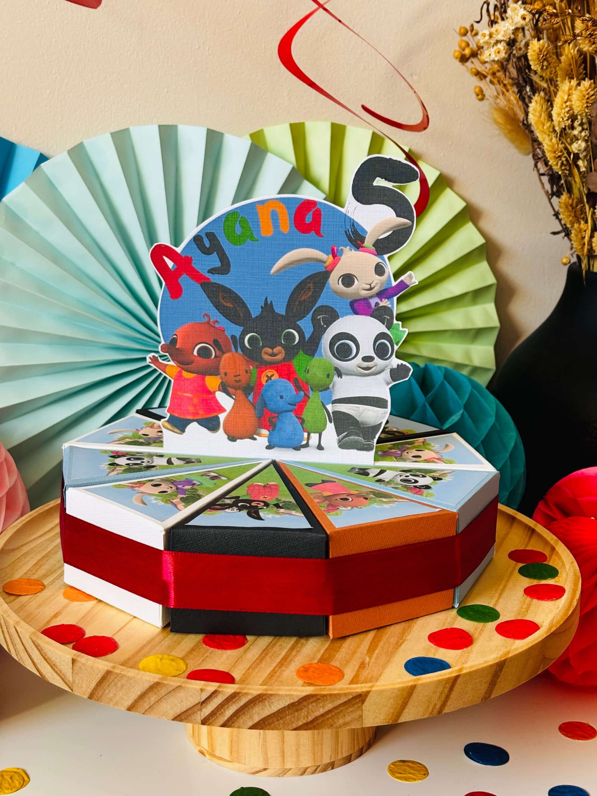 Op zoek naar een originele traktatie voor een verjaardag, school of kinderdagverblijf? Onze Konijntje Bing traktatie taart tovert gegarandeerd een glimlach op elk kindergezicht! Deze kleurrijke traktatie taart bestaat uit 10 stevige doosjes in de vorm van taartpuntjes, elk versierd met een favoriete Bing held. De doosjes worden gemonteerd geleverd en zijn klaar om gevuld te worden met kleine lekkernijen zoals Haribo snoepjes, rozijntjes, mini chocolaatjes, lolly’s, zuurtjes en meer. Perfect om uit te delen in de klas en een glimlach op elk kindergezicht te toveren!